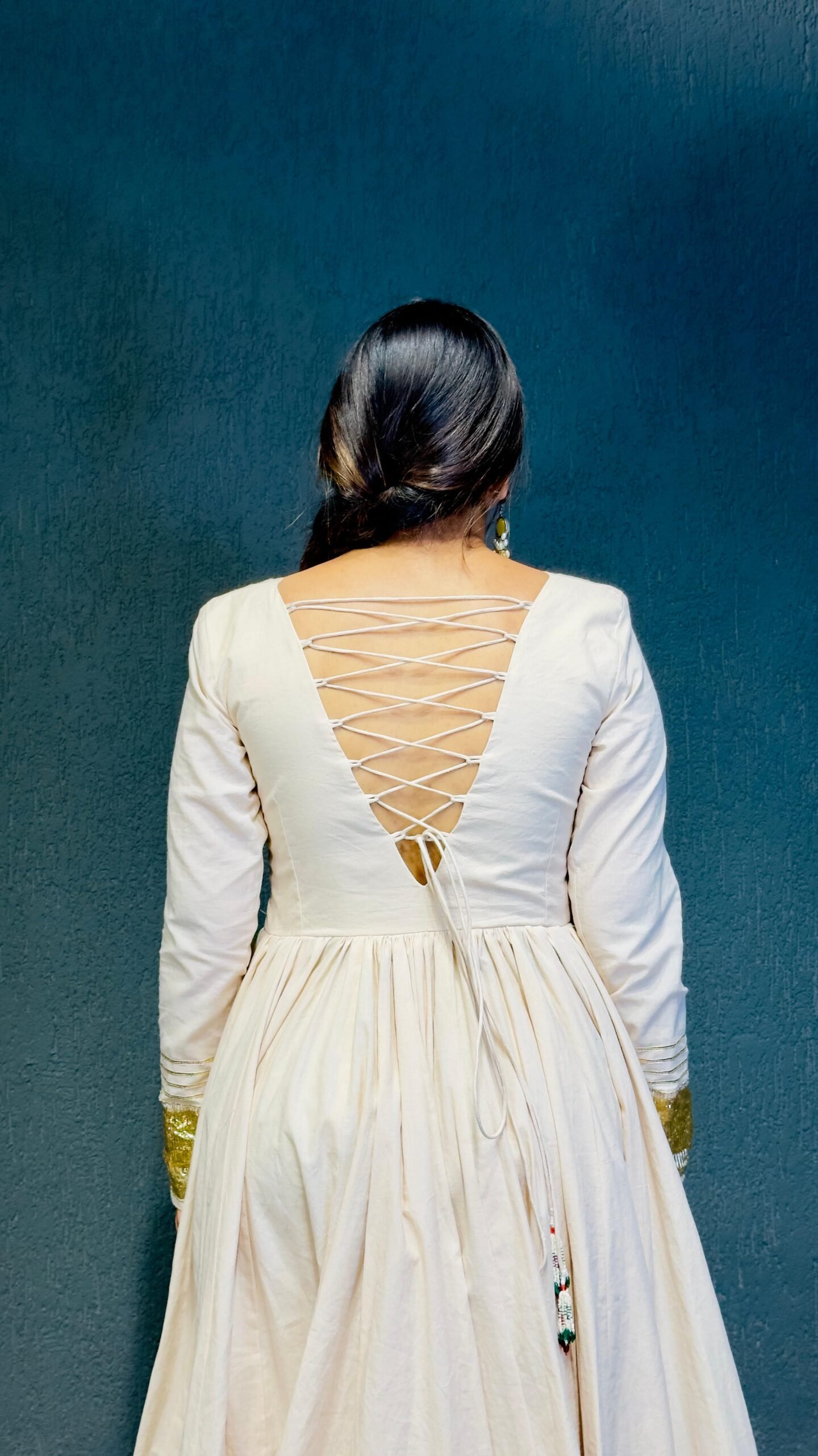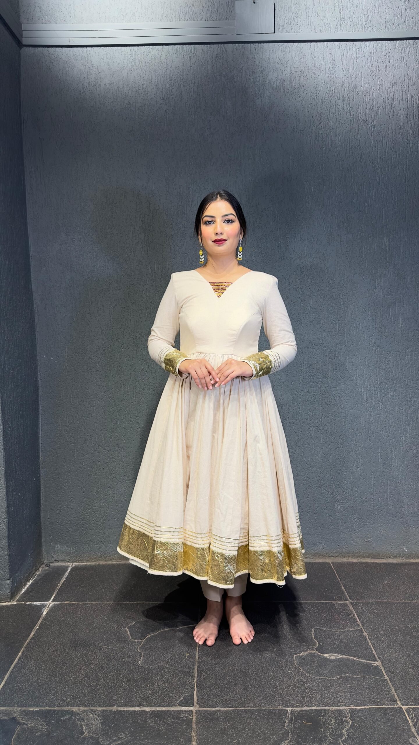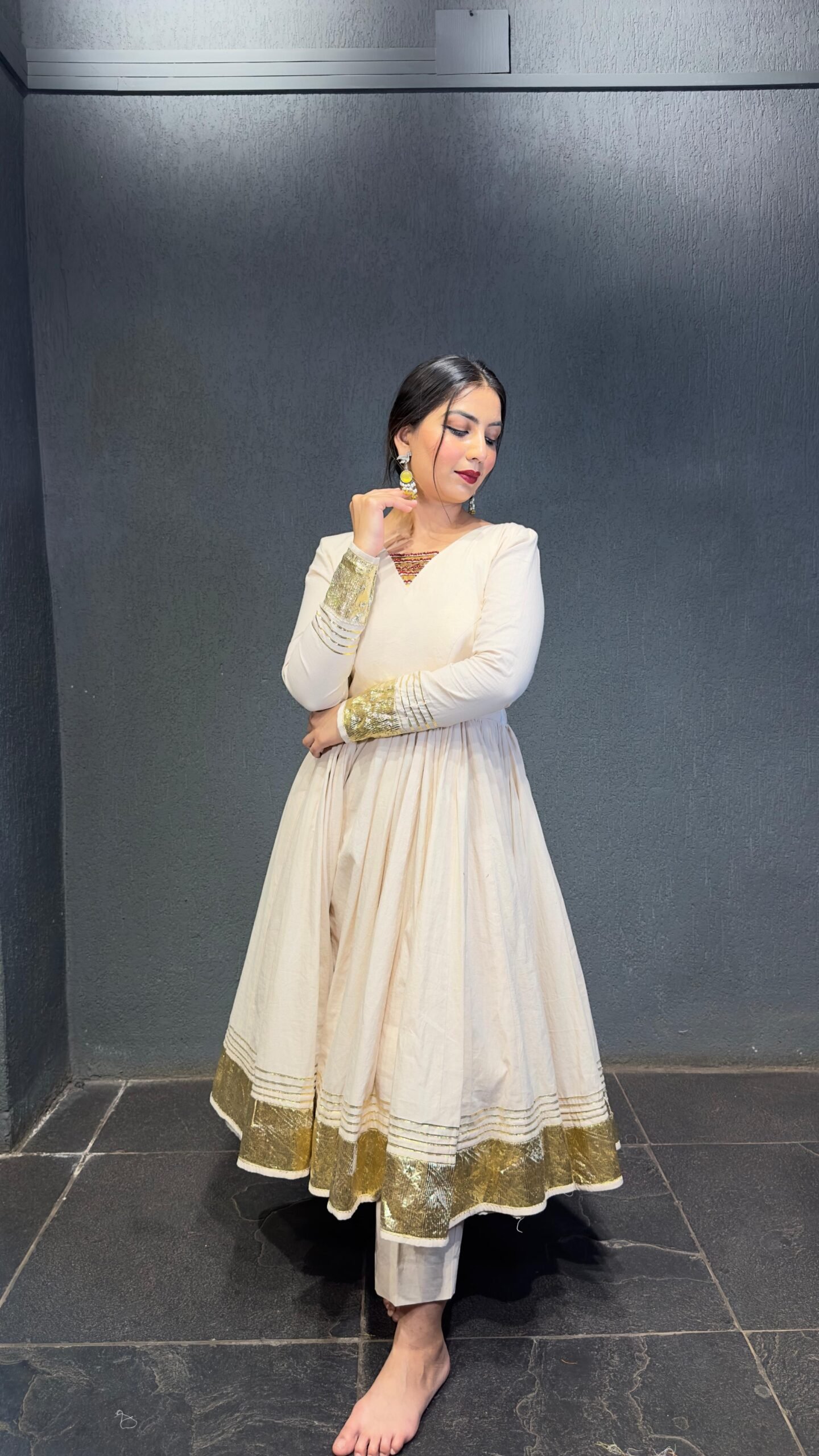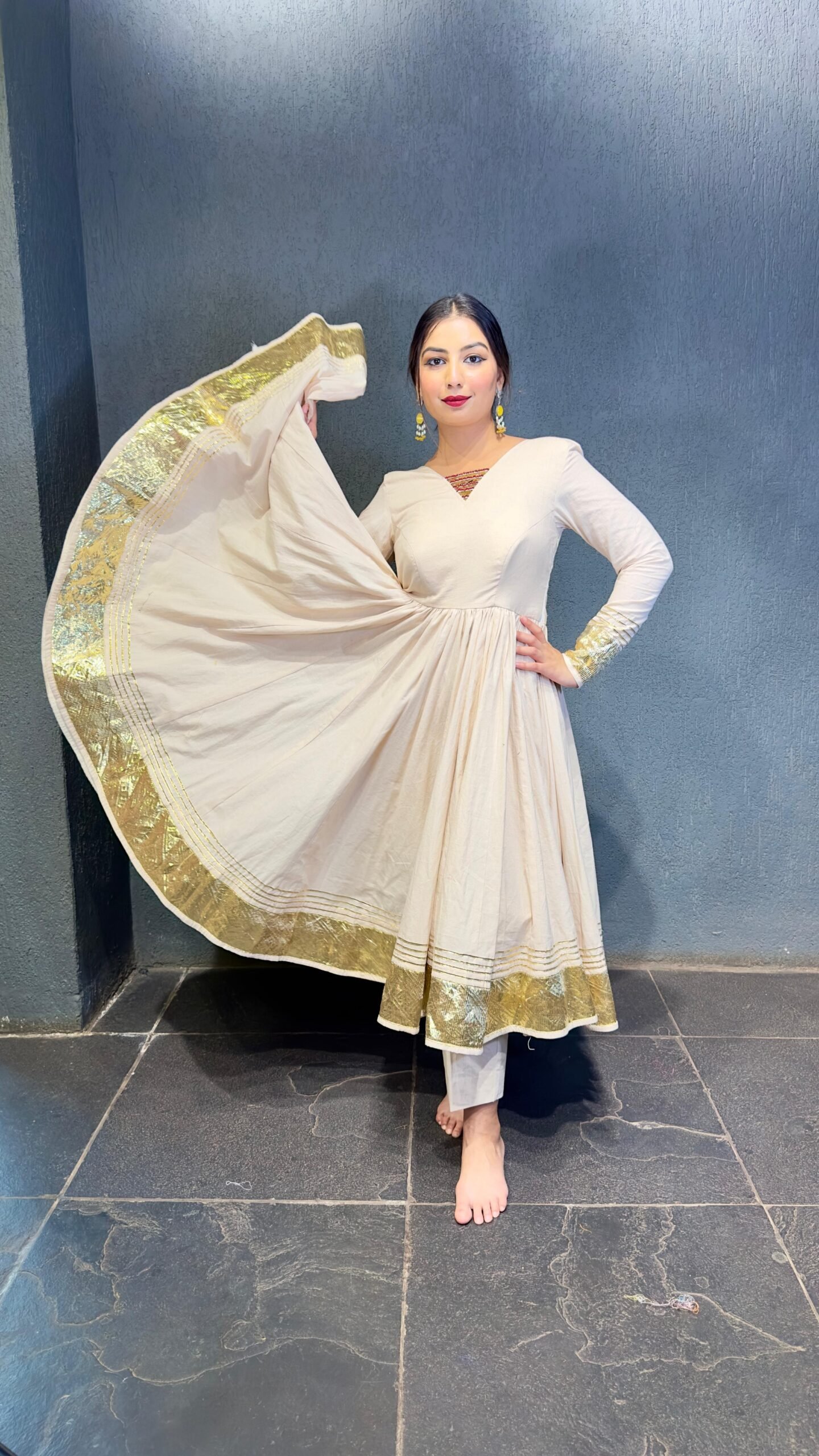 Crafted in premium pure cotton, this stunning Anarkali is all about comfort with elegance. The rich 12-meter flare gives a royal twirl, while the delicate gold glitter touch adds a hint of festive charm. The hand detailing on the front and back neckline makes this piece truly unique – where tradition meets timeless artistry